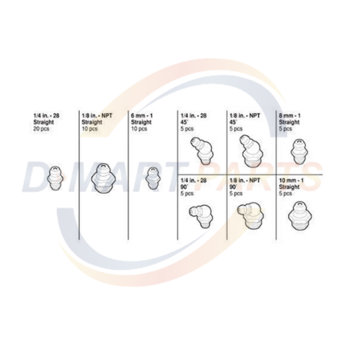 Contains 9 various popular sizes of grease fittings. Convenient re-sealable plastic case.